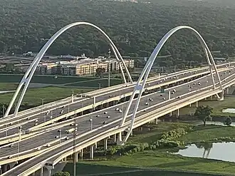 The Margaret McDermott Bridge is a conventional concrete pier-and-beam freeway bridge[3] with cable-stayed bike lines over the Trinity River in Dallas, Texas. It replaced the late-1950s to early-1960s Interstate 30 (I-30) bridge, which reached its end of life.[1] It was partially designed by Santiago Calatrava, and is part of the Trinity River Project and the Horseshoe Project.[1] It was named for Margaret McDermott, an area philanthropist.[2]