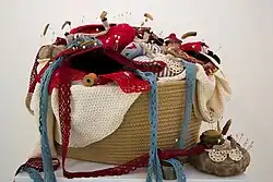 Her "Head in the Sand" is a wooden box sitting on four legs with a head-sized hole in the top and instructions to visitors to place their heads in the hole and wait. Inside is a chambered light and sound show with soft pastoral sounds, the hole serving as a sanctuary from the art exhibit itself.[3] "Head in the Sand" was included in her 2016 exhibition Resonating Object, an interactive mixture of sound, sculpture and videos, at South Puget Sound Community College in Olympia, Washington. The exhibition also included "I Long to Be Free From Longing" and "Material Shrine for the New Class", featuring dangling objects the visitor could squeeze to activate different sounds.[20] Her 2014 interactive sound installation "I Long to Be Free From Longing" won first place in the 23rd annual Juried Exhibition at the Athenaeum Music & Arts Library in San Diego.[21]