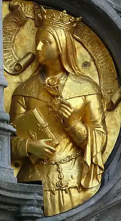Gilded statue of Margaret of York, supporting Mary of Burgundy, on the façade of the Basilica of the Holy Blood in Bruges, 1529–1533