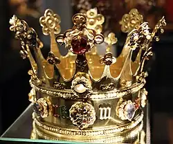 The crown is much too small to fit around a head, and was probably intended to be worn around a pointed hennin, or on top of piled-up hair. It may always have been intended to be presented at some point after the coronation as a votive crown for a famous statue of the Virgin Mary. Margaret presented the crown to the Church of Our Lady during a visit to Aachen in 1475. Today the statue, placed next to the altar in the cathedral, wears the crown on festive days. In 1475 a matching crown was fashioned for the child.[4]