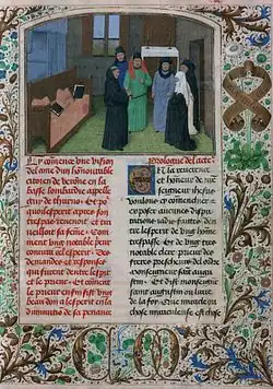 Margaret of York before the resurrected Christ, c. 1468, from her copy of Nicolas Finet's Dialogue de la duchesse de Bourgogne[2]
