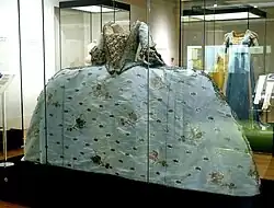 Tullie House Museum and Art Gallery holds a blue silk court mantua once owned by Jackson. The dress was made between 1750 and the early 1760s. Jackson would have been about 27 years old in 1750, but she was single, and such a dress was made for the use of a married woman at the royal court. The early provenance of the dress is unknown.[3][22] The skirt is 2.4 metres (7.9 ft) wide.[23] The mantua has been dated according to the shape of its hooped petticoat, which is fan-shaped in this case, but would have been more rectangular in the 1740s or late 1760s. The dress is in "pristine condition", and it retains its original stomacher and "hugely expensive" silver lace.[22] As of 2021 it was displayed in the new costume galleries at Tullie House.[24]