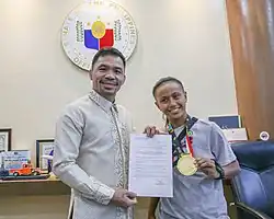 Following her achievement, she was named as the flag bearer of the Philippine delegation for the closing ceremony of the games.[17] As a gold medalist in the Games she will be entitled to ₱6 million of bonuses, which she plans to use to help her family start a business.[16]
