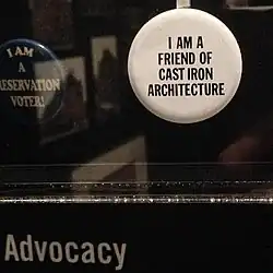 Margot Gayle described cast-iron architecture as her "all-consuming passion."[5] In 1970 she founded the group the Friends of Cast Iron Architecture (FCIA) as part of the opposition to Robert Moses's plan to build an expressway through TriBeCa and SoHo.[4] The expressway project was abandoned in 1971 and the 26-block SoHo Cast Iron Historic District was established in 1973.[2] It preserved important buildings and protected the neighborhood from the rapid development that was occurring in neighboring areas of Manhattan. To increase public appreciation of cast-iron architecture, Gayle and other FCIA members led walking tours of architectural landmarks in SoHo, handing out magnets to demonstrate that the facades really were made of iron.[5][13]