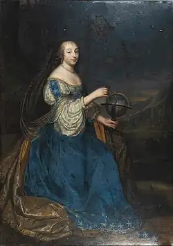 Her half length portrait by Balthazar Moncornet (1598-1668), dated 1658, is held by the British Museum.In an oval border, it shows her upper body in an elaborate dress adorned with pearls and jewels, with a hunting scene in the background. There are four lines of verse below the portrait,[6]