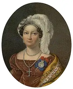 Her older sister, Yekaterina Sinyavina was said to surpass her in beauty, though opinions of contemporaries differed on their moral qualities. Many envied and slandered the Naryshkins, such as Rostopchin who described Maria and her husband as "people of false modesty and honesty, skillfully hiding their souls".[3] Meanwhile Vigel endowed Maria Alexeievna with "noble feelings, thrift, aristocratic pride and a tough disposition".[4]