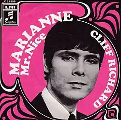 Following the Contest, it was rewritten in English by Bill Owen for Cliff Richard to record. "Marianne" features an accompaniment by the Mike Leander Orchestra and was released as a single in September with the B-side "Mr. Nice", written by Terry Britten.[4] It peaked at number 22 on the UK Singles Chart.[5]