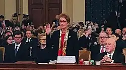 On November 15, 2019, Yovanovitch testified during the public impeachment hearings.[70] In her testimony, Yovanovitch detailed how Giuliani and his associates Lev Parnas and Igor Fruman worked with a corrupt Ukrainian prosecutor to orchestrate a smear campaign against her, oust her from her post as ambassador, and "circumvent official channels" of Ukraine policy.[55] Yovanovitch also testified, "Perhaps it was not surprising that when our anti-corruption efforts got in the way of the desire for profit or power, Ukrainians who preferred to play by the old, corrupt rules sought to remove me. What continues to amaze me is that they found Americans willing to partner with them and, working together, they apparently succeeded in orchestrating the removal of a U.S. ambassador. How could our system fail like this? How is it that foreign corrupt interests could manipulate our government?"[55] While Yovanovitch was testifying, Trump denigrated her on Twitter.[71] When read what the president had written about her, Yovanovitch testified: "It's very intimidating. I can't speak to what the president is trying to do, but the effect is to be intimidating."[71] House Intelligence Committee Chairman Adam B. Schiff and other Democrats called Trump's conduct witness intimidation; Democratic Representative Jim Himes, a member of the Intelligence Committee, stated: "The president chose to respond to a patriotic and superb public servant with lies and intimidation. ...Her boss disparaged and intimidated her not after, but during her testimony."[71] During questioning, the committee's Republicans avoided making personal attacks against Yovanovitch or seeking to undermine her credibility, but argued that Yovanovitch's removal and the events leading to it were not relevant to whether Trump had committed impeachable offenses and emphasized that Yovanovitch's removal occurred "before the main events under scrutiny took place."[72]