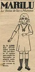 Marilú was an Argentine composition doll produced between 1932 and 1960, considered the most prominent and enduring doll in the country,[1][2] and an icon in the history of national toys.[3] It was created by Alicia Larguía, who was inspired by the French predecessor of Bleuette, a doll available through the famous magazine for girls La Semaine de Suzette.[2] Seeking to replicate this model, Larguía launched Marilú in association with Editorial Atlántida,[4] which was responsible for publishing advertisements and clothing patterns for the doll in its children's magazine Billiken, the most widely distributed in Latin America at the time.[5] In view of the doll's immediate success, Atlántida also published a weekly magazine for girls, Marilú, between 1933 and 1936.[5] The doll was originally imported from Germany, manufactured by the firm Kämmer & Reinhardt.[6] Sometime between 1935 and 1936, Larguía changed suppliers and began to order the dolls from König & Wernicke, which was also German.[7] During its first two years, Marilú was sold in an Atlántida store in Buenos Aires.[3] The doll was sold along with a variety of other products, such as clothing, accessories and furniture.[3] In 1934, Larguía became independent from the publishing house and opened her iconic store—Casa Marilú—on Florida Street, which in addition to selling the doll and its accessories, functioned as a prestigious prêt-à-porter fashion house for girls and young women.[8]