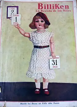 Marilú was created by Alicia Larguía, a professor from high society,[8] inspired by the French predecessor of Bleuette, a doll that the famous magazine for girls La Semaine de Suzette gave to its subscribers, in addition to publishing weekly patterns to sew clothes for her.[2] Since there was no magazine for girls with these characteristics in Argentina, Larguía turned to the children's magazine Billiken—the one with the greatest circulation in Latin America at that time—since "it was close in format and ideology."[5] The friendship between Larguía and the Virgil family, who owned the Editorial Atlántida that published Billiken, was decisive for Marilú's launching through the children's magazine.[5] The doll was launched to the market in November 1932,[2] and its first batches were sold in a section that Atlántida gave to Larguía in its store at 720 Lavalle Street, Buenos Aires.[5] Billiken published advertisements and a weekly section of patterns so that girls—who were called "mommies" (in Spanish: mamitas)—could sew clothes for the doll, linking it definitively with the publishing house.[5]