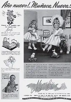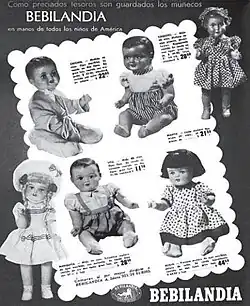 In 1946, the factory was renamed Muñecas y Plásticos Bebilandia and entrusted the firm Udavill with part of the commercialization of its products.[18] The commercial partnership between Larguía and Constancio Cecilio Vigil—director of Atlántida—continued to be very close, and from the second half of the 1940s the characters created by the latter had a greater presence in Bebilandia and in Casa Marilú, where they were sold in the form of dolls and appeared in the designs of fabrics or embroidery.[18] Throughout the 1940s, Bebilandia produced a wide variety of models, which reflected the importance and dominance of the firm, the most prominent in the country during the decade.[18] In addition to Marilú and Bubilay, other dolls produced by Bebilandia were Pepito, Tito, Minguito, Chicín, Fifi, Carlitos, Titina, Alicia, Martita, Lita, Pebete, Bebita, Pompón, Coquito, Lolo and Lolita, Mariquita (formerly Periquita), Martita, Carmencita, Lucita, Pinita, Yiye and Pillín, among others.[9][18]