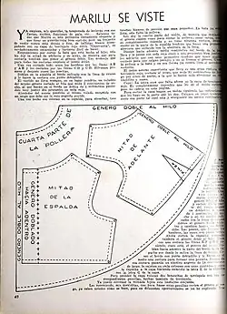 The game proposed by Marilú revolved, on the one hand, around the transmission of motherhood to young girls, who referred to as the doll's "mommies"; although the doll's clothing also played a pivotal role.[13] Advertisements encouraged girls to regularly change and update the doll's outfits based on occasions or seasons, effectively promoting the Marilú brand's accompanying clothing line.[13] Moreover, both Billiken and Marilú magazines included sections that featured clothing patterns that girls or their family members could use to sew the doll's wardrobe; and also provided instructions and fashion tips for this purpose.[7][13] These sections included style comments that were typical of fashion magazines, such as the right combination of colors or rules of good behaviour.[12] This positioning aligns Marilú with the lineage of fashion dolls, akin to Gaultier dolls, Huret dolls, and more contemporary examples like Vogue dolls and Barbies.[7][13]