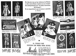 From 1940 until its discontinuation in 1960, Marilú was manufactured in Buenos Aires by the firm Bebilandia.[16] This new version made in Argentina introduced a "subtle change in skin tone from pink to citrine".[8] The material of the Argentine-made Marilú was a paper pulp that resulted in "warm and light pieces", something that the manufacturers highlighted as one of the main advantages of the product; as for example in the Commercial and Industrial Dictionary of the Argentine Republic of 1942: "In its manufacture, only papier maché is used, which constitutes an advantage in relation to the imported dolls, since the mentioned paper reduces the weight of the toy and makes it much more affordable for export and for the handling of the children".[9]