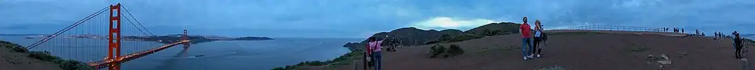 The area has views of San Francisco and, as such, is a tourist destination. One of the most common photographs of San Francisco is the view of the city from the Headlands with the towers of the Golden Gate Bridge just reaching out of the fog. On clear days, the site offers views of the bay, including the Farallon Islands, Angel Island, Alcatraz, the San Francisco–Oakland Bay Bridge, the Golden Gate Bridge and the East Bay.