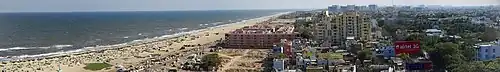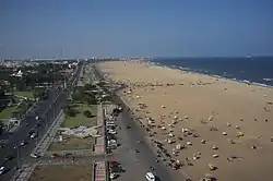 Marina Beach, or simply the Marina, is a natural urban beach in Chennai, Tamil Nadu, India, along the Bay of Bengal. The beach runs from near Fort St. George in the north to Foreshore Estate in the south, a distance of 6.0 km (3.7 mi),[1] making it the second longest urban beach in the world, after Cox's Bazar Beach.[2][3][4] It is a prominent landmark in Chennai.