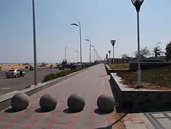 All the 14 sections vary significantly from one another and were designed in such a way as to the differentiation of sections not leading to any break in the walkway, which is a continuous walking stretch from the Triumph of Labor Statue to the Kamaraj Statue.[53] One of these galleries is flanked by two semi-circular stainless-steel pergolas resting on wire-cut brick columns. The galleries can accommodate over 1,000 people. The choice of natural stones and pillars used in each section of the promenade was based on the type of the buildings on the other side of the road. The walkway was designed as low-lying as is necessary to have a clear view of the beach from the road. A total of 428 octagonal poles with seagull-shaped light fittings and additional high-mast lamps have been erected.