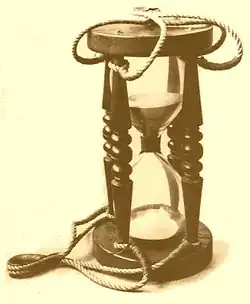 A marine sandglass is a timepiece of simple design that is a relative of the common hourglass, a marine (nautical) instrument known since the 14th century (although reasonably presumed to be of very ancient use and origin). Sandglasses were used to measure the time at sea or on a given navigational course, in repeated measures of small time increments (e.g., 30 minutes). Used together with the chip log, smaller marine sandglasses were also used to measure the boat speed through the water in knots.