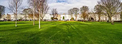 The crescent was built by Charles Ffolliott in 1792 as a spite wall to block the view of Dublin Bay from the now demolished Marino House and its better-known folly, the Casino at Marino, which was much coveted by its owner, James Caulfeild, 1st Earl of Charlemont .[2][3] The terrace was built with red brick front finishes in a similar method to Mountjoy Square and Merrion Square however, owing to the fashion of the time the fronts were plastered over during the Regency period and all of the facades remain in the same state as of 2020.[4]