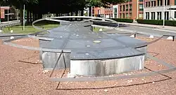In 1979 the performance L'Uomo Volante takes place in De Vleeshal exhibition space in Middelburg, during the opening of Boezems solo exhibition Space Sculptures. The body of Marinus Boezem is one of the materials in this work. Boezem is dressed in a sort of airman's suit. Behind him stands a mirror which he holds in uneasy balance by means of ropes slung over his shoulders. A tense balance exists until he can no longer hold the weight and has to let go. The mirror is dashed to pieces on the floor. The Gothic vault of De Vleeshal is reflected in the fragments.[8] The Gothic arch motif is frequently found in Boezem's work, as in Etude Gothique (1985). This sculpture lies in the middle of a marketplace in the city centre of 's-Hertogenbosch. It is a thirty-centimeter-high podium of polished granite terrazzo in the form of a gothic arch. The sculpture acts as though it were the shadow of an imaginary arch. It lies at a point where the most important functions of the old city come together. That is on one side it points in the direction of the St. Jans Cathedral (religion), on the other side the sculpture offers a view of the Stadhuis (government). The marketplace where the work is situated lies in the middle of a shopping area and is a place of economic activity (economy). The sculpture has also a social purpose in the urban space because it can function as a seat.[9]