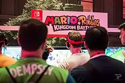 Kingdom Battle was intended to be revealed at E3 2017, but some info was accidentally leaked before then.[8][21] An image of Mario and Rabbid Peach posing with weapons was leaked. When the concept was met with negative reception, the development team became discouraged and lost morale, which caused Soliani to emphasize a unique experience because of it. Soliani was in a constant state of panic before its full reveal and urged his development team to not get their hopes up. When major details about the game were revealed at E3 2017, Miyamoto came and helped Soliani pitch the game to the audience. Upon seeing the game in full, fans showed curiosity and excitement in it.[12][22] When Soliani saw the praise, he teared up on stage with excitement and relief, and his reaction became an internet meme.[7][23] After the conference, Soliani received 37 awards for the performance. When he returned to work, the company's morale was greatly boosted.[7]