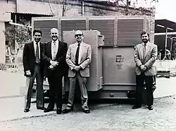 In 1968 they produced more power-generating equipment as Potencia Industrial, S.A., and in the early 70's, his children Mario and Carlos joined the company. Years later, the firm grew from making small motors of 1 to 50 horsepower (HP), to huge industrial motors and generators up to 10,000 HP.[9] The enterprise also became a benchmark for wind and hydro-power industry, and uninterruptible power systems, after several patents in these technologies; as in the case of the "Hummingbird" or "Colibrí", a permanent magnet generator of 5 and 10 kilowatts (kW), in commerce since 1975.[10] According to various publications, is "the first Mexican wind turbine, besides being a global pioneer in permanent magnet direct drive generators."[1][6][11][12][13] By 1980, close to 600 units were exported to the United States and Canada.[14]