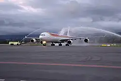 The inaugural flight allowed officials to test the performance of check-in counters and other systems. The flight lasted nine minutes and the plane was met by a water cannon salute at the new airport.