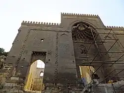 The monumental building, despite falling into ruin over the years, is nonetheless one of the most impressive structures in historic Cairo.[3] What remains today is mostly the facade and the walls of the main hall; the upper floors and interior of the building having collapsed or disappeared some time ago, along with some other outlying structures.[5][1][2] The building is located on higher ground than most of the surrounding area. Its entrance is located on its southeastern side, facing northeast. This entrance leads to a vestibule, which then leads to a large courtyard or main hall around which the northwestern part of the building is centered.[2]