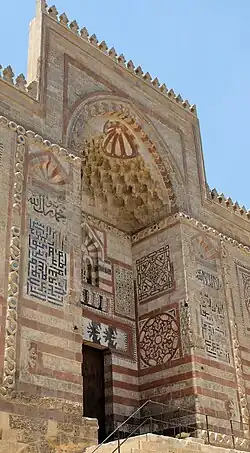The frontal facade is tall and imposing, and features a surprising richness of ornamentation and colour.[3][2] Both here, on the exterior, and around the arches of the main hall/courtyard, are bands of carved stone that look like linked chains and serve to frame various elements of the architectural composition.[2] The entrance is set within a monumental recessed portal crowned by a vault or canopy of muqarnas (stalactite-like carvings) within a rectangular frame that projects higher than the rest of the building's facade; all of which is typical of Mamluk architecture.[2] The overall facade makes use of ablaq masonry (alternating dark red and light stone) masonry, but more elaborate ablaq patterns appear above the doorway. On both lateral (side) walls of the portal are two "roundels" of differing floral and geometric compositions created using red stone.[2] Outside the portal, two even larger roundel patterns of this kind appear above the windows on either side of the portal. Between these and the portal are keel-shaped niches (originating from Fatimid architecture) with radiating red and light stone, below which are inscriptions in Arabic (in either thuluth or naskhi forms), formed with red paste or stone, which together appear to form the shahada.[3][2] Further below these inscriptions are panels of "Square" Kufic script, formed with inlaid lapis lazuli blue tiles.[2] One unusual detail is also found above the doorway: here, set along the middle of a double window, are two small decorative columns with carved snakes wrapping around them, which could be a symbol of healing.[1]