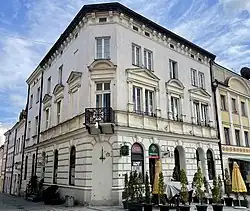 - Tenement at 14 Rynek Street: A two-story tenement with glassed-in arcaded arches. Rebuilt in the 16th century with an arcade and a second floor, it was damaged in the 1735 fire and rebuilt without the arcade by 1796. A second floor was added in 1866, and the arcade and original interior were restored between 1960 and 1962.[29] From 1767 to 1787, it housed Tarnów's first royal post office, commemorated by a plaque. It now contains a restaurant and hotel. It was listed in 1998.[12]
