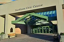 The Markham Civic Centre is the city hall of the city of Markham, Ontario. The brick and glass Civic Centre was designed by architect Arthur Erickson with Richard Stevens Architects Limited and was opened on May 25, 1990. The entrances, except for the great hall entrance, are named after communities in Markham (Unionville, Milliken, Thornhill). The building is adjacent to an 11.5-hectare park with a large pond reflecting the south façade.
