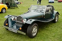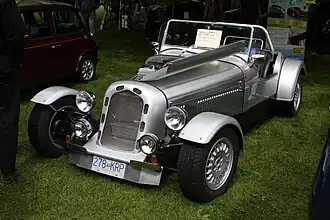 The Roadster was the original car and was based around components from the Triumph Herald range (which included the Spitfire, Herald, Vitesse and GT6). The two-seat body, built of aluminium and glass fibre, had a radiator grille slightly similar to pre-war Alfa Romeo sports cars. As standard, any of Triumph's 4- or 6-cylinder engines of the time could be fitted (1147-2498cc), along with overdrive or non-overdrive gearboxes. In 1981, the Morris Marina became the donor car, replacing the Triumph; the Marina engine became standard, although many customers fitted engines, gearboxes and back axles of their own choice. Fitted with the two-litre inline-six from a late Triumph Vitesse, a top speed of 177 km/h (110 mph) was achievable.[5]