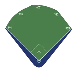 | Field size | Left field line – 344 ft (105 m) Left-center power alley – 386 ft (118 m) Center field – 400 ft (120 m) Right-center power alley – 387 ft (118 m) Right field line – 335 ft (102 m) Backstop: – 47 ft (14.3 m) ![]() |