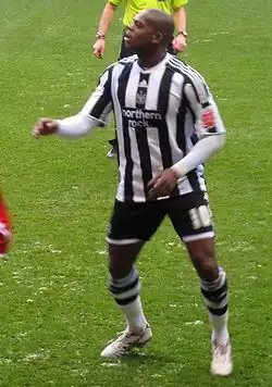 On 24 September 2009, Harewood joined Championship side Newcastle United on a three-month loan until December.[20][21] He made his debut on 26 September 2009 in a 4–0 win over Ipswich Town, coming on as a substitute for Nile Ranger in the 64th minute.[22] His first goal for the Magpies came, in a 1–1 draw, against Queens Park Rangers on 30 September 2009 in the following game.[23] He then scored a brace to help Newcastle win 3–0 against Swansea City on 28 November 2009 and keep the Magpies top of the table.[24] He scored in a 2–2 away draw at Barnsley.[25] His fifth of the season came on 20 December 2009, scoring the opening goal in the 2–0 win Tyne–Tees derby at St James' Park.[26] Following his return to Villa from Newcastle, Harewood was injured and unable to play for the rest of the season. Aston Villa decided not to renew his contract at the end of the season.