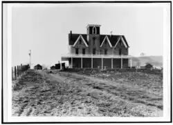A highlight of the park is the home of John Marsh, which was begun in 1853 and completed in 1856, and which has been undergoing extensive renovation for several years. Marsh was the first non-Hispanic white settler to live in the county.[15] The property encompassed by Marsh Creek State Park was part of Rancho Los Meganos, (Los Meganos is a Spanish phrase meaning "sand dunes"), which Marsh acquired in 1838. Initially, Marsh lived in a four-room adobe house which had been built on the property for him by local Miwok Indians. Marsh apparently got along well with the Miwoks and had even provided them with free medical care. In return, the tribesmen built the adobe house.[16] After he married Abby[a] Tuck in 1851, he retained San Francisco architect Thomas Boyd to design a grand new mansion. Many of the features apparently were stipulated by Marsh himself.[14] John's wife, Abby, had selected the site for the house along Marsh Creek. The new Gothic Revival style house was three stories high and had an observation tower that rose 65 feet (20 m) into the air. Marsh built the tower so that he could see the approach of strangers from a great distance. Rustlers and marauders frequently came to his ranch to steal cattle or steal other valuables. However, the stone tower proved vulnerable to earthquakes. The original tower collapsed during the 1868 Hayward earthquake. It was rebuilt with wood, but the replacement collapsed again after the 1906 quake.[16] Images from the Historical American Building Survey (HABS) collection in the Library of Congress shown here depict the differences in the two structures. This house is the earliest substantial building in Contra Costa County that was not built entirely of adobe.[14]