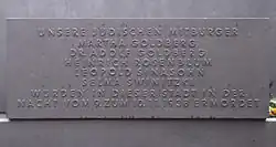 Fritz Köster subsequently gave the command to shoot Adolph and Martha Goldberg in Burgdamm and the mechanic Leopold Sinasohn in the neighboring rural community Platjenwerbe, which is now a part of Ritterhude. All three were murdered in the night on 10 November 1938. The Goldbergs were "woken abruptly at 5 in the morning on 10 November" by an SA Scharführer unknown to them, August Frühling, and "shot and killed in their living room".[7] Frühling was a member of the Lesum SA unit Reservesturm 29/411 under the command of the SA Obersturmführer Friedrich Jahns, who assisted in the killing of Martha and Adolph Goldberg.[8]