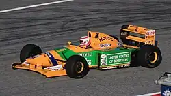 In 1992 he had a productive season, with a strong finish to the year. He came close to a win at Canada, where having overtaken Schumacher and closing on leader Gerhard Berger, the transmission failed.[4] He never outqualified teammate Michael Schumacher, but made up places with excellent starts (sixth to third at Silverstone), outraced the German at Imola, Montreal, Magny-Cours and Silverstone, and scored a notable second place at Monza. At Spa, Brundle went by when Schumacher went off the track. Schumacher noticed blisters on his teammate's tyres on his return to the circuit and came in for slicks, a move that won him the race. Had Brundle not been distracted he would have pitted as planned at the end of that lap, with victory the most likely result.
