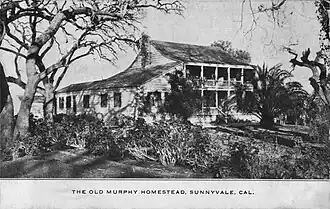 In 1849, Murphy Jr. relocated to the Santa Clara Valley and purchased half of the Rancho Pastoria de las Borregas from Mariano Castro for $12,500 (equivalent to $472,450 in 2024) in 1850. Murphy established a wheat farm and cattle ranch. In 1850, he commissioned a prefabricated wood-frame house from a lumber mill in New England. He arranged for it to be shipped around Cape Horn and then reconstructed on his newly acquired property. Due to its unobstructed view of the southern region of San Francisco Bay, the Murphy family renamed it "Bay View." The 20-room home was located at 252 North Sunnyvale Avenue.[5][7][8]