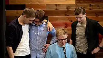 ![]() Members of Martin S. (from left to right: Uladzimier Bośka, Andrej Marčanka, Hiera Supakoŭ, Iĺlia Baśko) in the studio during the filming of a live-video for the single "Novy Dzień" (February 2019) | |