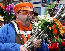 The Martinshorn (also known as the Martin's trumpet and Schalmei) is a German free reed aerophone created in 1880 by Max Bernhardt Martin, who was also the main manufacturer of the instruments.[1] The Martinshorn contains several reeds, each of which having its own horn.[2] The instrument was created in imitation of the saxhorn.[3] The horn can be confused with the shawm, as they are both referred to by the name "Schalmei"; the origins of the similar naming is unknown.