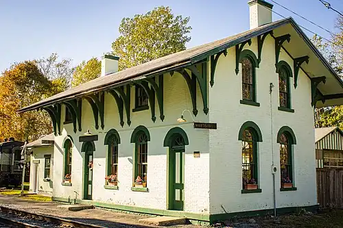 Martisco station, also known as Martisco Station Railway Museum, is a railroad station in Martisco, Onondaga County, New York. It was built in 1870 by the Auburn and Syracuse Railroad, and is a two-story, Italianate style brick building. Decorative brackets support an unusually long overhang of the roof. The line and station were eventually acquired by the New York Central Railroad. The station is owned by the Central New York Chapter of the National Railway Historical Society, and is open as a museum during limited hours in the summer. Adjacent to the station is a contributing Pennsylvania Railroad dining car.[2]: 3