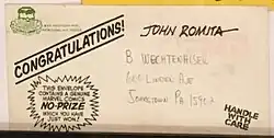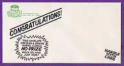 As time went by, some recipients of the "award" began to write Lee and ask why they had not received an actual prize.[3] In response, in 1967 Lee began mailing No-Prize-winners pre-printed empty envelopes[3][12] that said "Congratulations, this envelope contains a genuine Marvel Comics No-Prize which you have just won!" However, some uncomprehending fans wrote back asking where their prize was, even going so far as to suggest their prize had fallen out of the envelope.[3]