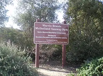 Marvin Braude Mulholland Gateway Park is a 1,500-acre (6.1 km2) park in the Santa Monica Mountains, with its trailhead at the southern terminus of Reseda Boulevard in Tarzana, Los Angeles, California. The park was named for former Los Angeles City Councilman Marvin Braude, who for more than 30 years led the effort to preserve the Santa Monica Mountains. Owned by the Santa Monica Mountains Conservancy, the park is within the Santa Monica Mountains National Recreation Area.[1]