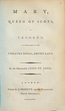 Mary, Queen of Scots is a 1789 historical tragedy by the British writer John St John. It premiered at the Theatre Royal, Drury Lane in London on 21 March 1789.[1] Its Irish premiere took place at the Crow Street Theatre in Dublin on 22 December 1802. The original Drury Lane cast included Sarah Siddons as Queen Mary, John Philip Kemble as the Duke of Norfolk, James Aickin as Sir William Cecil, William Barrymore as Lord Herries, John Hayman Packer as Davison, Robert Benson as Earl of Shrewsbury, John Phillimore as Earl of Huntingdon, John Fawcett as Sir Amias Paulet, Matthew Williames as Beton, Sarah Ward as Queen Elizabeth, Jane Farmer as Lady Douglas and Charlotte Tidswell as Lady Scrope.