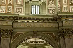 • At the base of the cupola: This text is fragmented into four physical sections. It is based on Revelation 4:8 from the Apocalypse and dedicated to the glory of God: "Holy, Holy, Holy, the Lord, who is, who was, and who is to come." (Latin: "Sanctus sanctus sanctus Dominus qui erat qui est qui venturus est.")
