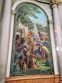 A paintings of the first Mass celebrated at Rivière-des-Prairies by Fr. Denis Jamet. The painting is one of several located inside the cathedral.