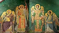 In 1912, the Wellesley Hills First Congregational Church commissioned Hazelton, who was a member, to paint wall murals[22][24] for the church. One mural depicts the four virtues—truth, charity, justice, and faith—in eight-foot figures of three women and one man. For instance, the male figure carries a sword and scales to represent justice. She also created murals of the Four Evangelists and a representation of the Trinity.[24]