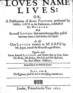 5. ^ Love, Mary; Love, Christopher (1651). Love's Name Lives, Or, A Publication of Divers Petitions Presented by Mistris Love to the Parliament in Behalf of Her Husband: With Severall Letters that Interchangeably Pass'd Between Them a Little Before His Death : as Also One Letter Written to Mr. Love by Mr. Jaquel, One of the Witnesses Against Him : Together with Seven Severall Letters and Notes Sent to Him from Dr. Drake, Mr. Jenkyn, Mr. Case, and Mr. Robinson, His Then Fellow-sufferers. printed in the yeer.