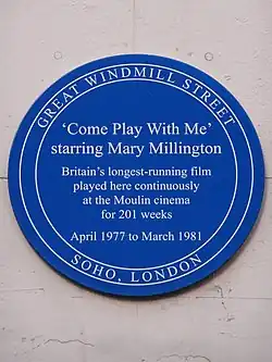 A nightclub in Liverpool is named after her.[11] She is commemorated with a blue plaque on the site of the former Moulin Cinema in Great Windmill Street, Soho for her appearance in Come Play with Me. The film is listed in the Guinness Book of World Records as running there continuously for 201 weeks, from April 1977 to March 1981, making it the longest-running British film.[26] The validity of this record and the blue plaque have been called into question by film historian Allen Eyles who says that Come Play with Me ran for 165 weeks and that Britain's longest running film was South Pacific, which ran for four years and twenty-two weeks.[35] Nevertheless, Come Play With Me stands as one of the longest-running films in British movie history.
