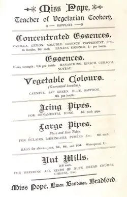 Pope authored a series of articles on vegetarianism in Isabella Reaney's Mothers & Daughters.[17] Around 1895, Pope lectured on vegetarianism cookery in Lancashire.[5] In the same year, she supervised the menu for a vegetarian restaurant in Halifax.[5] In addition to her teaching and writing, Pope sold a variety of seasonings, food colourings, and grinders, which she stocked at a warehouse in Bradford.[5][10]: 133