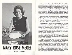 Mary Rose McGee entered politics as a Democrat, and was Town Clerk of Huntington from 1967 to 1976. She was a member of the New York State Assembly in 1977 and 1978. In November 1978, she ran for re-election, but was defeated by Republican Toni Rettaliata.